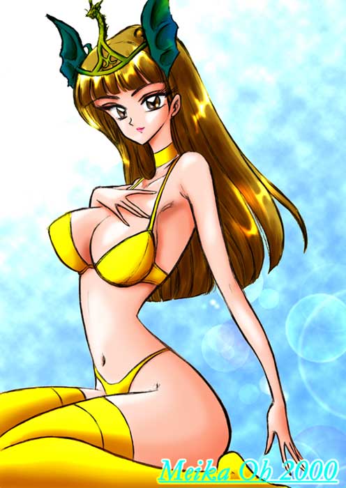 2000年の年賀状用に書いた物ですね。 急いでたので鉛筆で描いた下書きを 直接スキャンしてペインターで一気に 塗っちゃいました。 背景は後から雲模様とか 逆光フィルターで簡単にすませちゃいました。 絵的には辰年だったので 何かからみが無いとって事で 頭に竜の飾りを付けてみました。